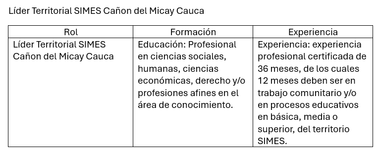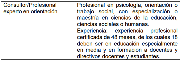 Deseable experiencia en educación inclusiva, atención a la diversidad, discapacidad, enfoque de género, víctimas de conflicto armado, trabajo con comunidades campesinas, rurales o con pertenencia étnica.